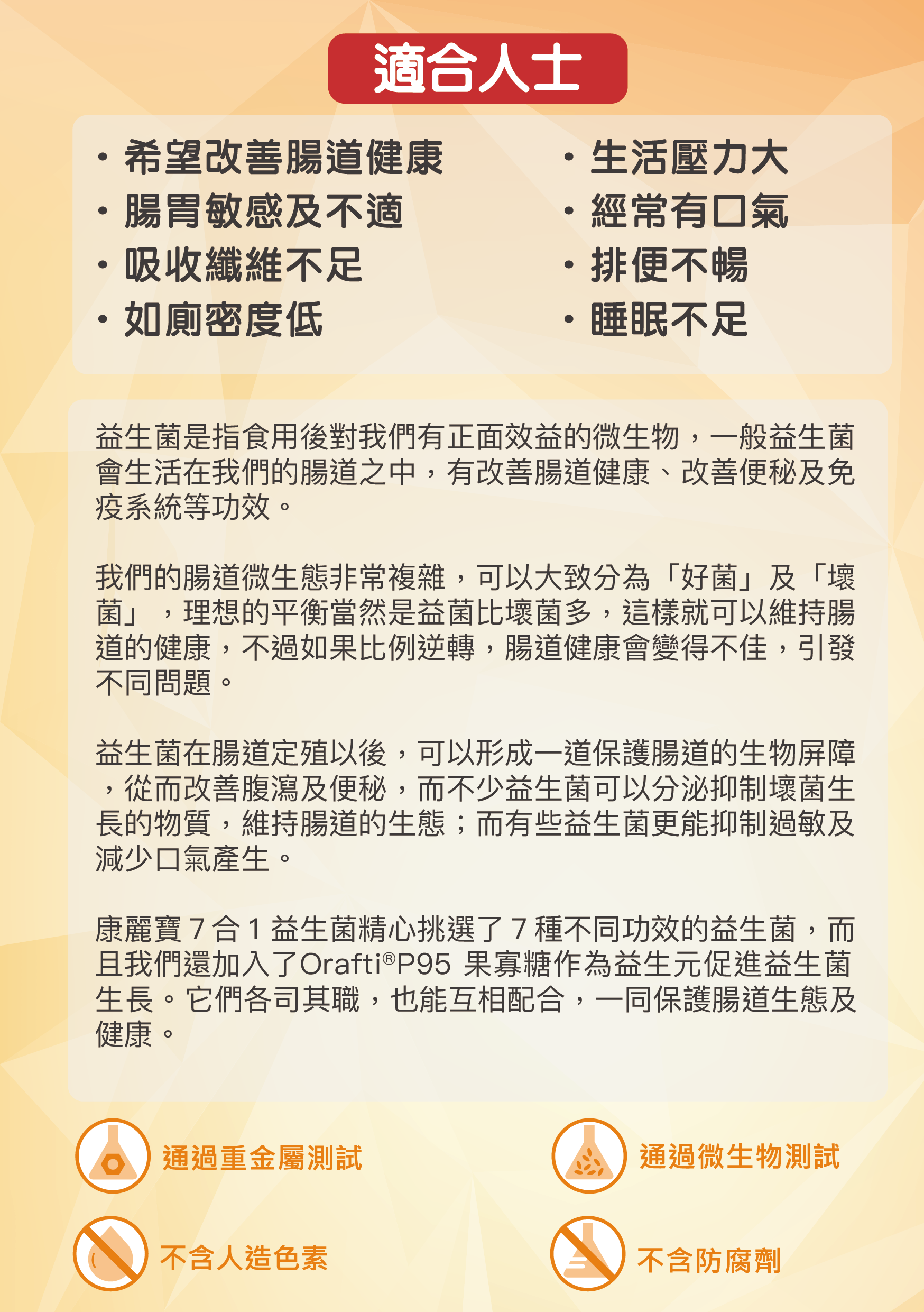 請仔細閱說明。請存放於兒童不能接觸之位置。懷孕、哺乳、敏感症患者、正在接受藥物治療或懷疑對產品成份敏感人士,需諮詢醫生意見方可服用本產品。本產品並非治療或預防疾病之藥物,效果需視乎個別體質而定。