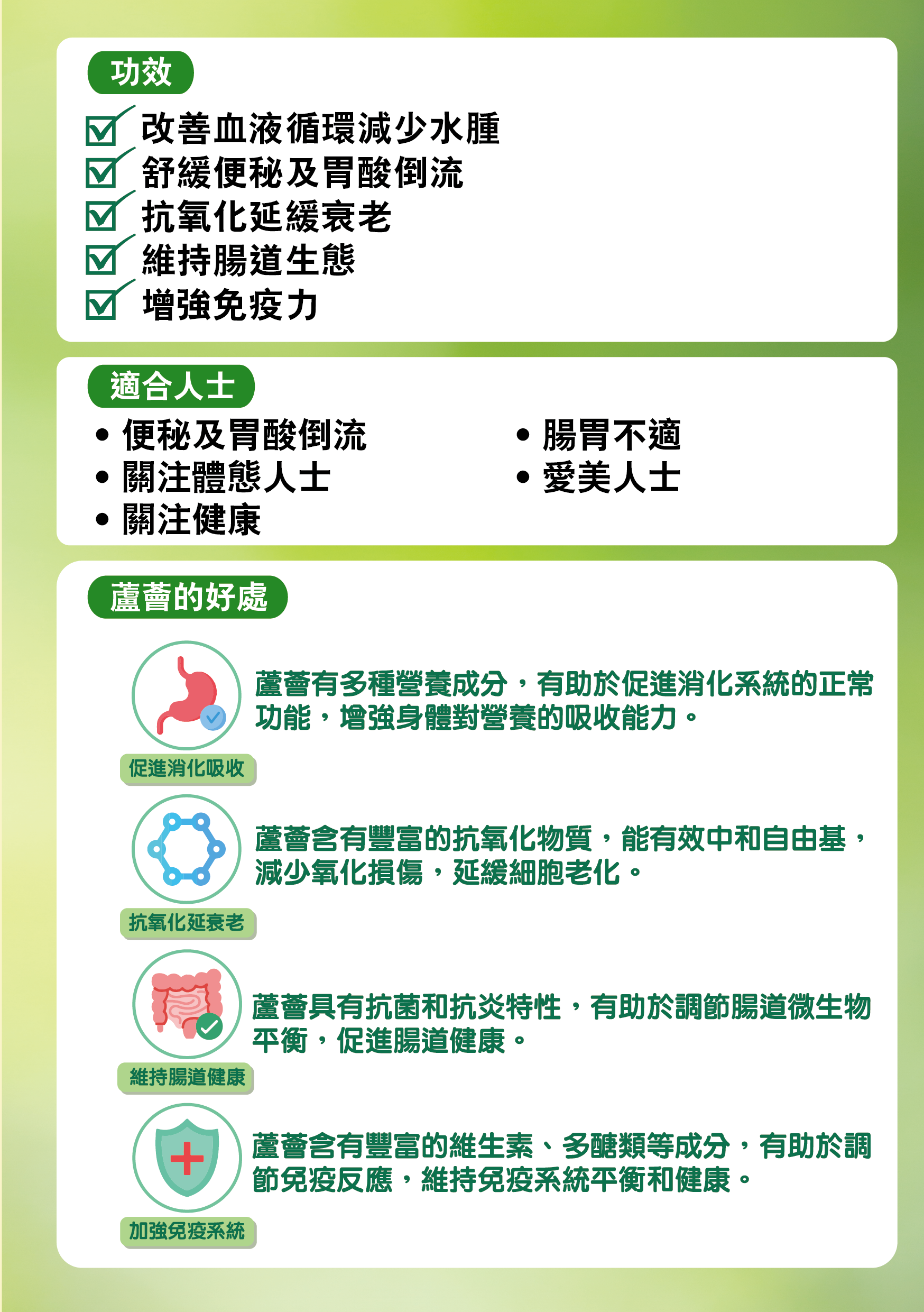 • 舒緩便秘及胃酸倒流