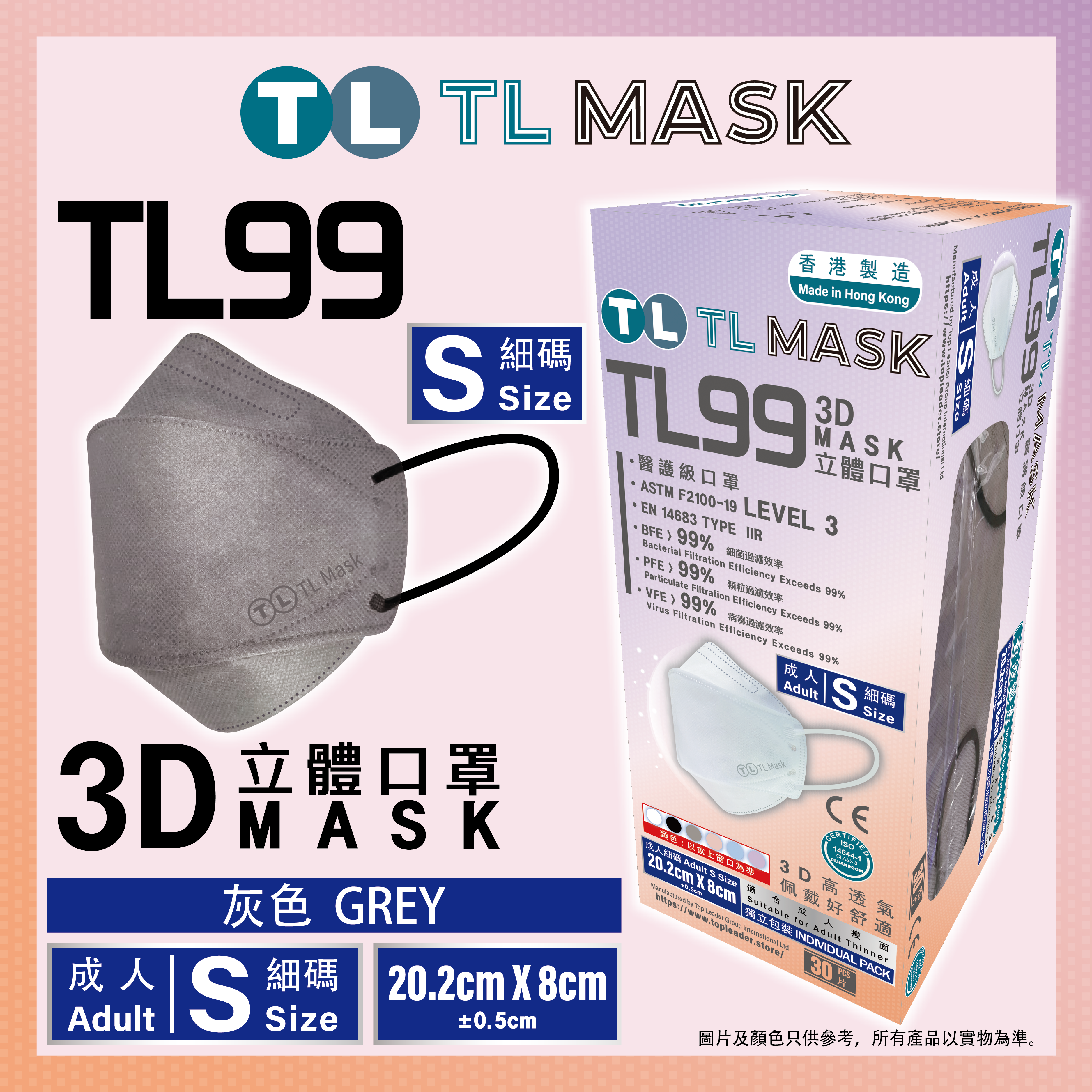 TL Mask【成人細碼】3D立體口罩 TL99 灰色1盒(30片獨立包裝)